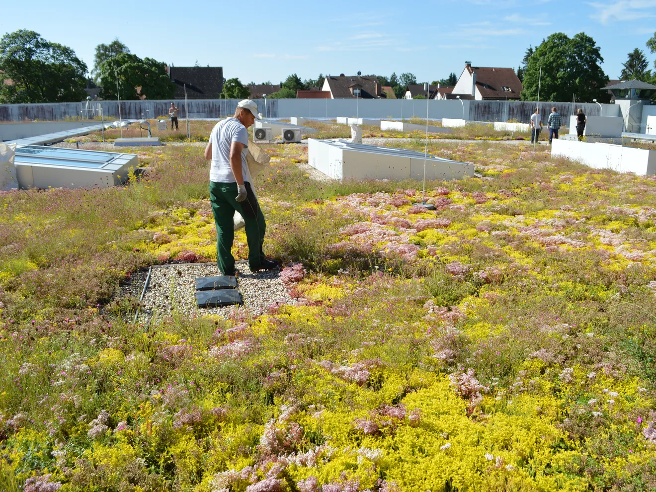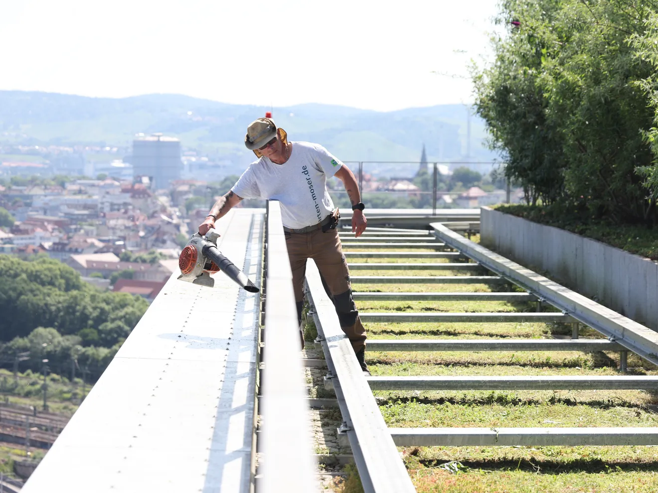 Ein Gründach muss gepflegt werden, um für Langlebigkeit und Ästhetik zu sorgen. Wer dabei aber an hohe Kosten denkt, liegt falsch. Bei einer Extensivbegrünung reicht es, im Frühjahr zu mähen und abgestorbene Pflanzenteile zu entfernen. Im Herbst wird der Wildaufwuchs beseitigt und jeweils die Entwässerung geprüft und gesäubert.