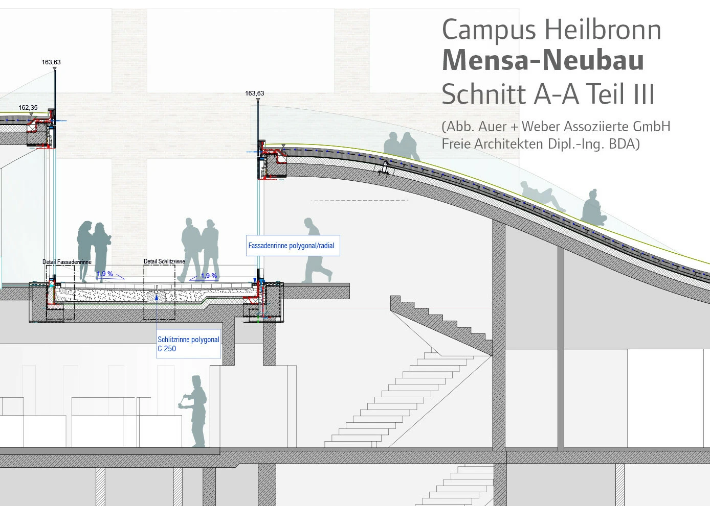 In Heilbronn speisen die Studenten an ihrem Campus unter grünen begehbaren Dächern. Die in drei Etagen gegliederte neue Mensa befindet sich im Innern zweier künstlicher Hügel, die von einer mehrfach gekrümmten, ca. 1000 m2 großen Dachschale bedeckt ist. Unser Team Dachbegrünung übernahm die aufwändige Begrünung der begehbaren Flächen mit Rasen.