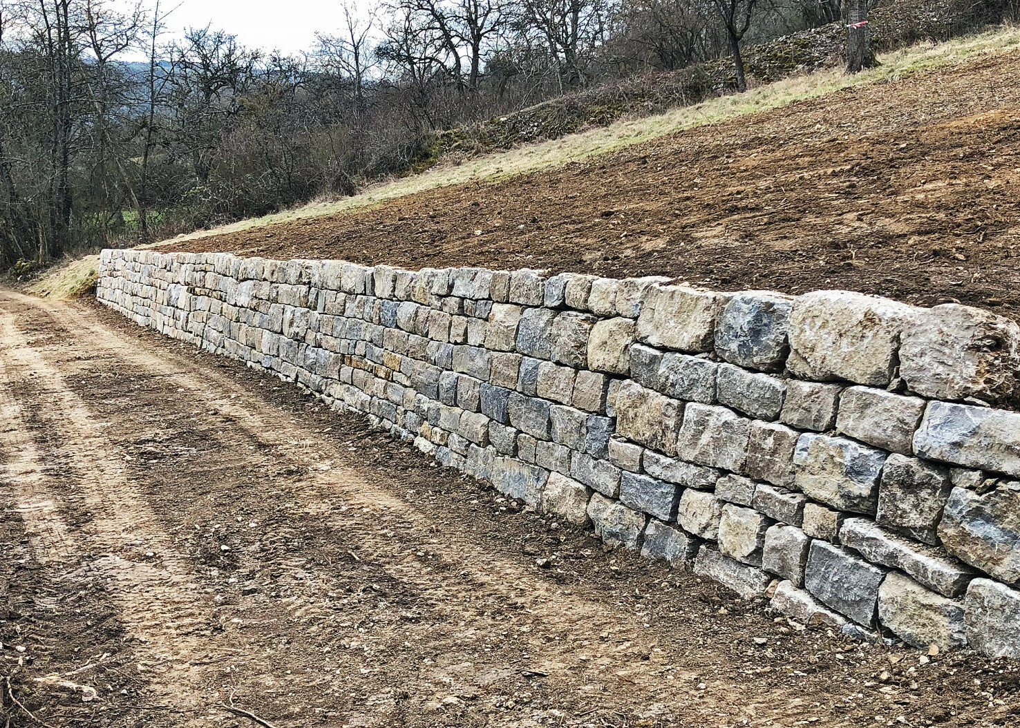 Für diese Arbeiten wurde unser Pflegeteam Mühlacker von der Gemeinde beauftragt. Zunächst mussten die völlig verwilderten Grundstücke freigelegt und Sträucher, Bäume, Unrat, usw. komplett entfernt werden. Anschließend wurden die Flächen gefräst, planiert und regionale Blumenwiesen-Mischungen angesät. Noch vorhandene Trockenmauern wurden gerichtet und fünf neue, bis zu 25 Meter lange Trockenmauern aufgebaut. Ebenso schuf unser Team neue Eidechsenhabitate mit Steinwällen und pflanzte 42 Obstbäume neu.