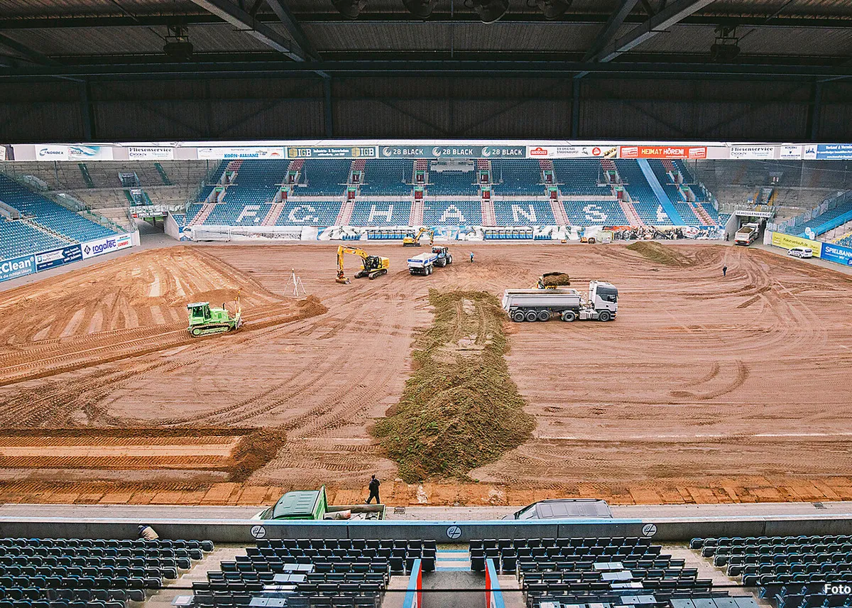 Am Sonntag rollte noch der Ball, am Montag drauf schon unsere Bagger: pünktlich am 14. November fiel der Startschuss beim F.C. Hansa Rostock für die Sanierung der Rasenheizung. Der Zweitligist nutzt die WM-bedingte Spielpause für die dringend erforderliche Baumaßnahme im Ostseestadion.