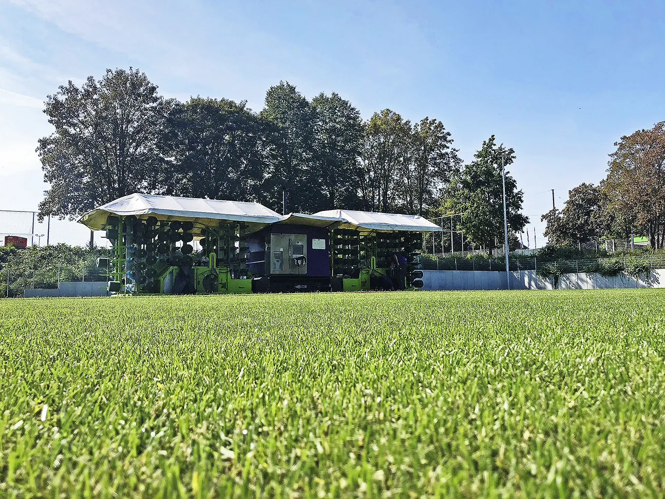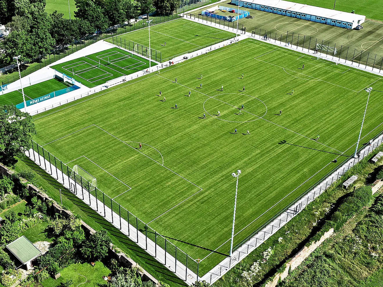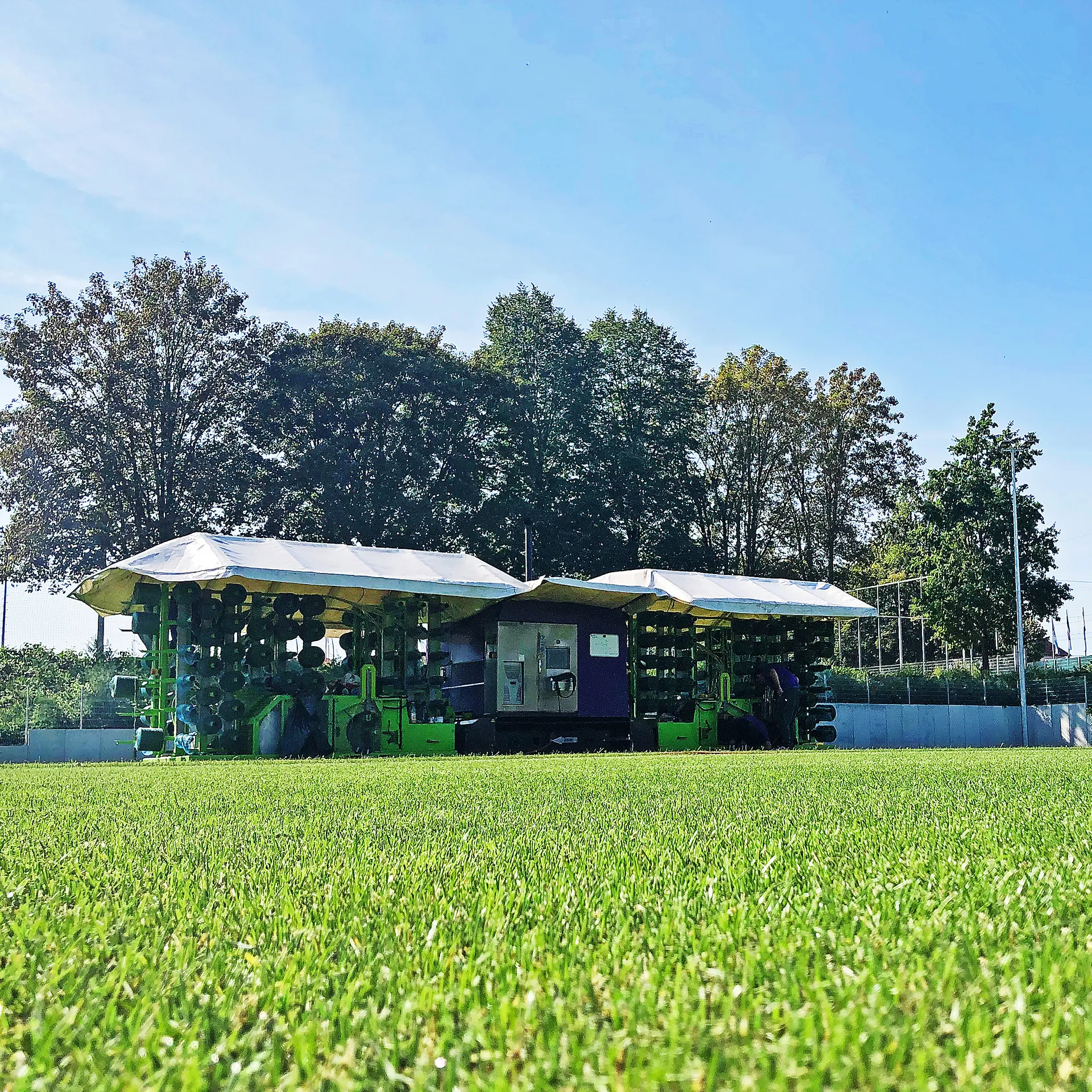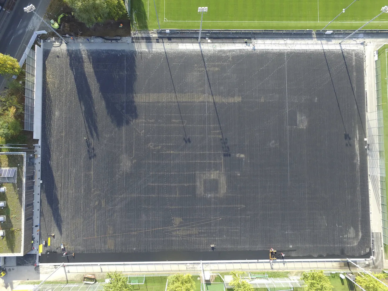Was von oben einfach aussieht, ist im Grunde hoch komplex. Für die richtige Bespielbarkeit, Standsicherheit und Scherfestigkeit ist der Rasenaufbau entscheidend. Ebenflächigkeit braucht dagegen Spezialmaschinen, mit denen wir auch eine sparsame Rasenheizung und gute Be- und Entwässerungssysteme bauen.