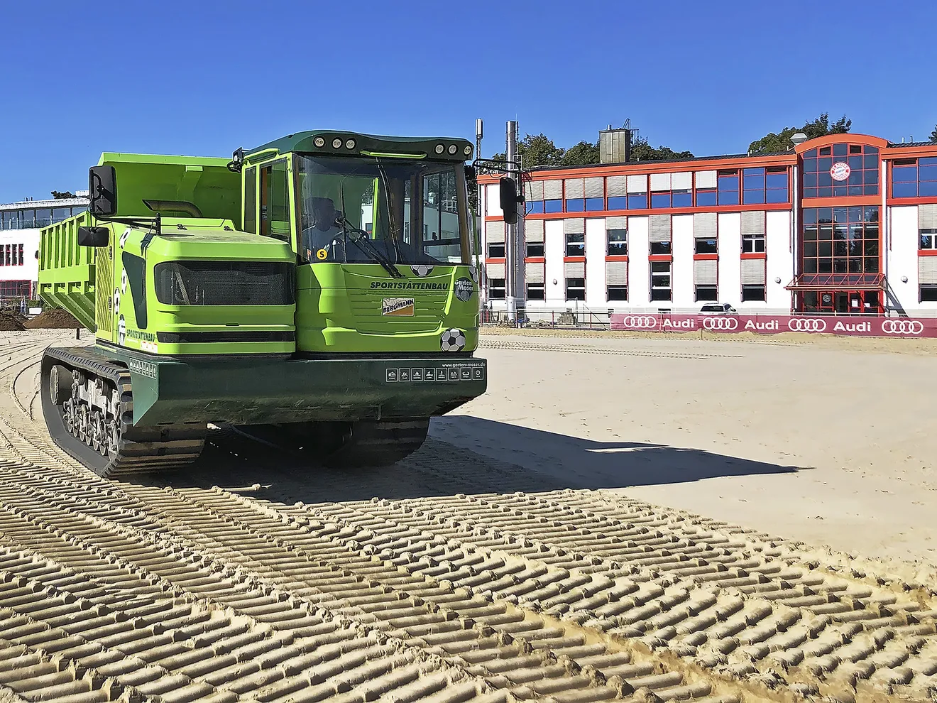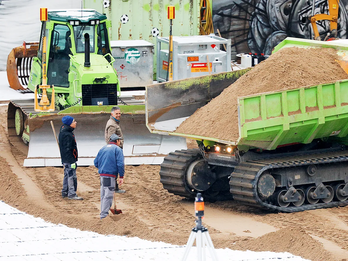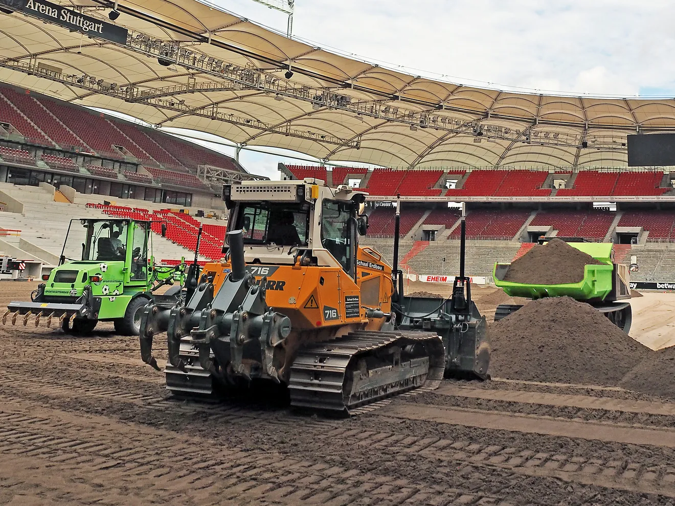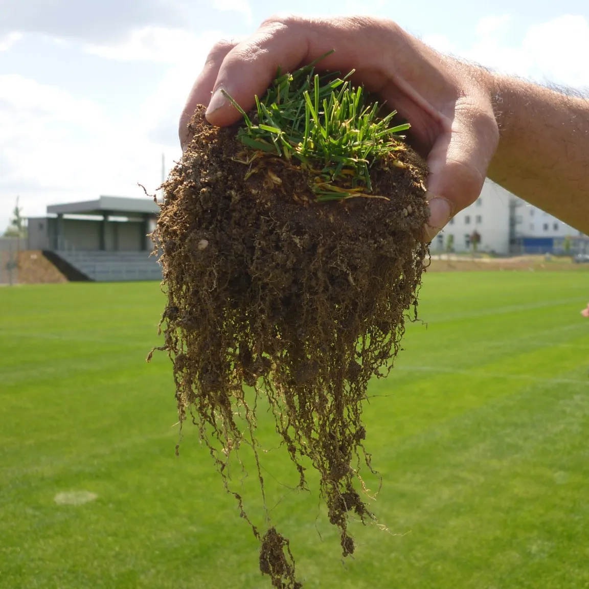 Was von oben einfach aussieht, ist im Grunde hoch komplex. Für die richtige Bespielbarkeit, Standsicherheit und Scherfestigkeit ist der Rasenaufbau entscheidend. Ebenflächigkeit braucht dagegen Spezialmaschinen, mit denen wir auch eine sparsame Rasenheizung und gute Be- und Entwässerungssysteme bauen.
