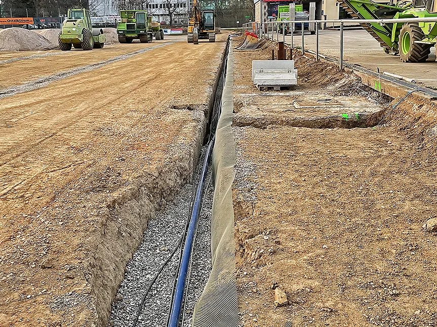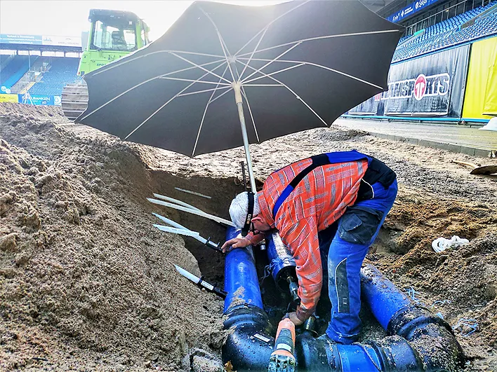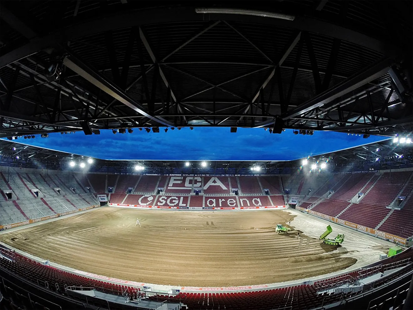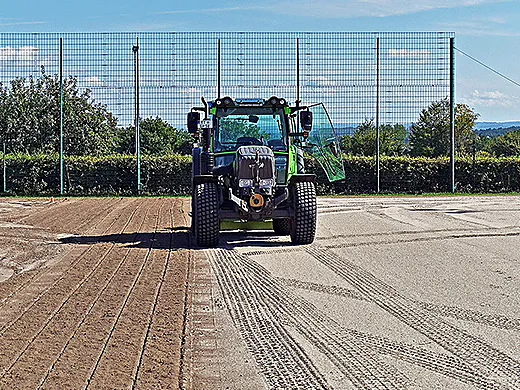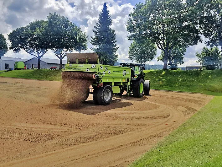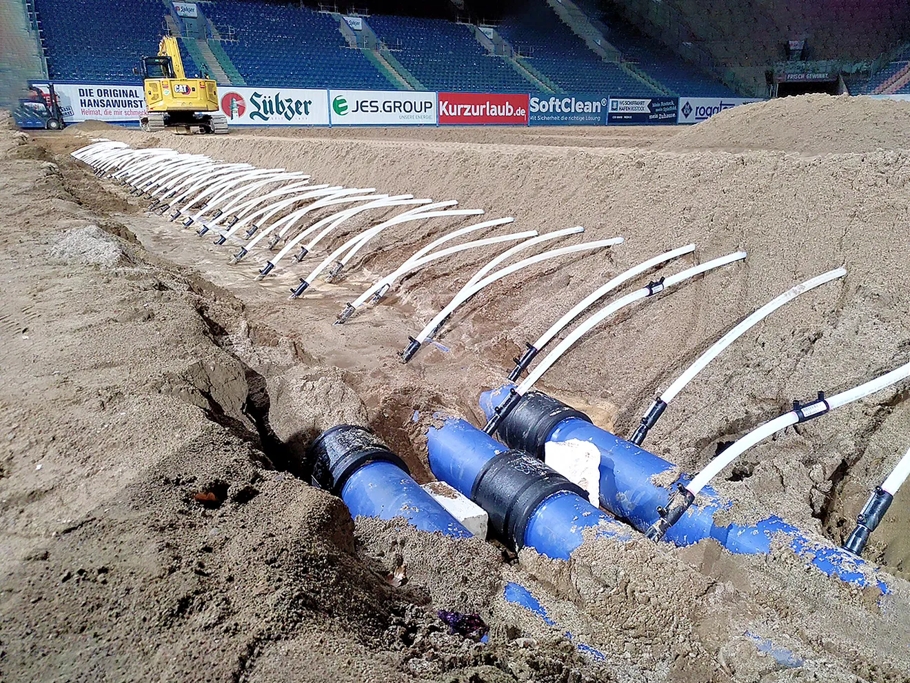 Was von oben einfach aussieht, ist im Grunde hoch komplex. Für die richtige Bespielbarkeit, Standsicherheit und Scherfestigkeit ist der Rasenaufbau entscheidend. Ebenflächigkeit braucht dagegen Spezialmaschinen, mit denen wir auch eine sparsame Rasenheizung und gute Be- und Entwässerungssysteme bauen.