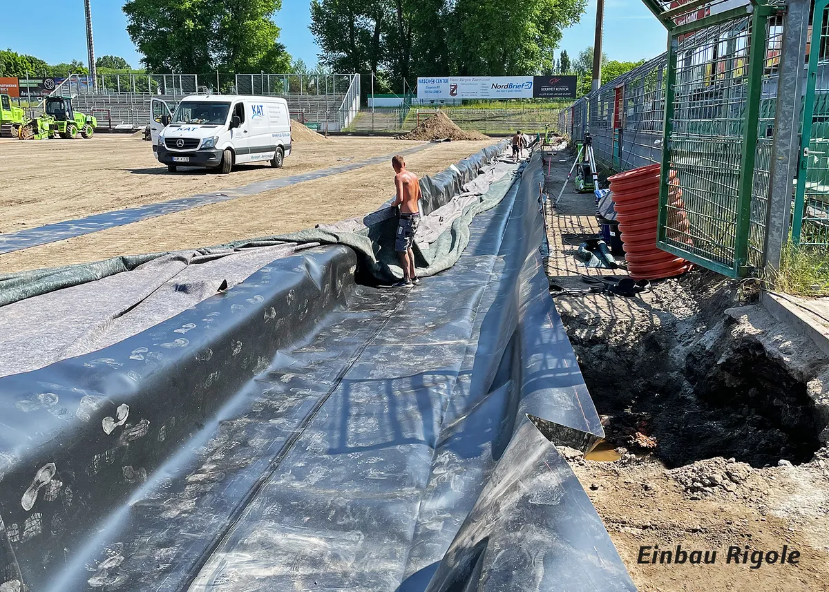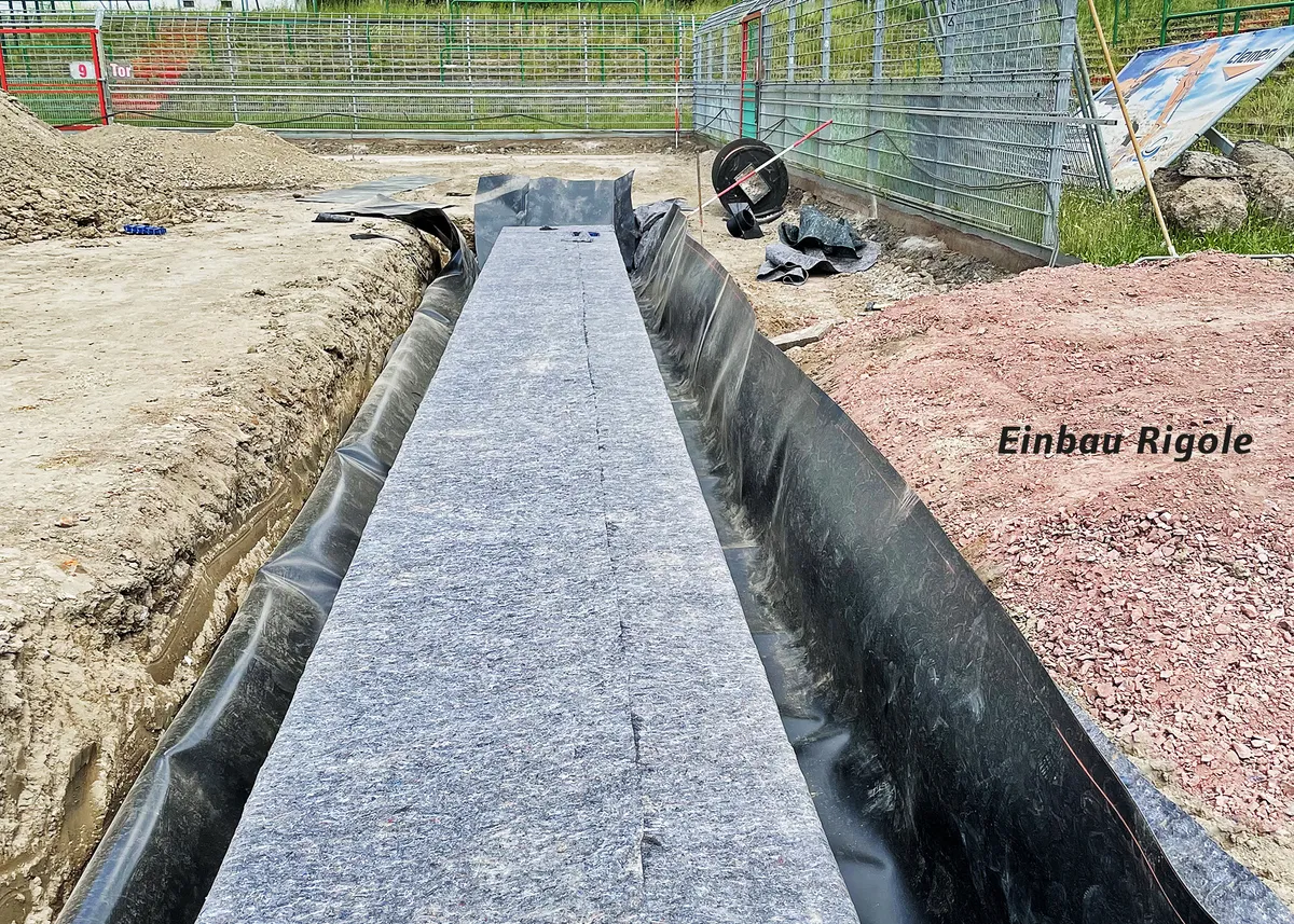 Eine Besonderheit war der Einbau einer Rigole entlang einer kompletten Längsseite des Spielfelds. Die quaderförmigen Rückstauelemente dienen als Zwischenspeicher, aus dem das überschüssige Regenwasser nach Starkregen über einen Drosselschacht „gebremst“ in die städtische Entwässerung abgeleitet wird.