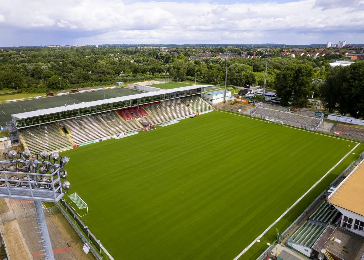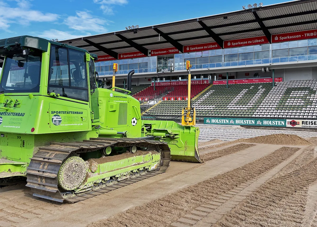 20 km vor der Ostseeküste und nur knapp 10 Minuten vom Lübecker Holstentor entfernt, stellte unser Team Essingen im bereits 1929 eröffneten Stadion an der Lohmühle seine Leistungsfähigkeit unter Beweis. Die brauchte es auch, um die Komplettsanierung des Innenraums mit 9.300 m² Rasenfläche in der strammen Bauzeit von nur 8 Wochen zu realisieren.