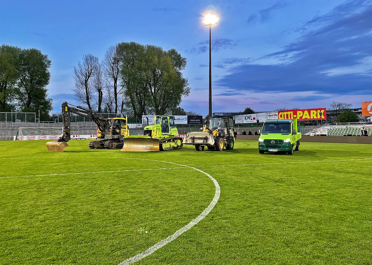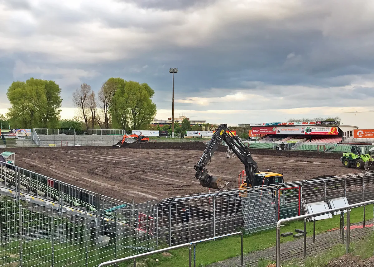 Die Heimat des VfB Lübeck besaß keine Rasenheizung, was aber Auflage für die 3. Bundesliga ist. Und so war unser Team direkt nach dem letzten Heimspiel zur Stelle und begann mit dem Abtrag der alten Erdschichten. Insgesamt wurden rund 10.000 t Erdmaterial ausgehoben und wieder eingebaut – jeweils in einer Gesamthöhe von 50 cm. Dabei mussten auch kontaminierte Böden fachgerecht ausgebaut und entsorgt werden.