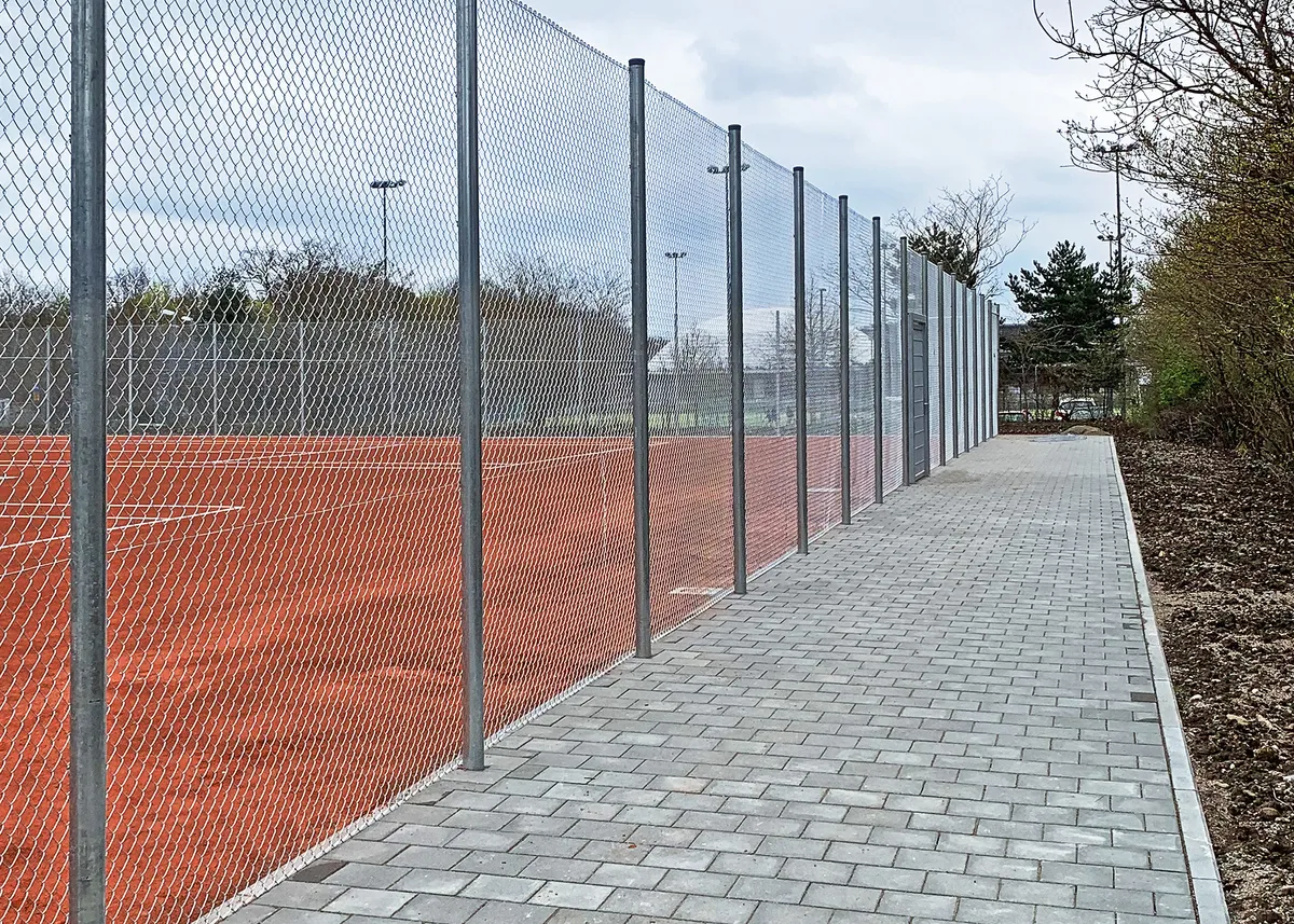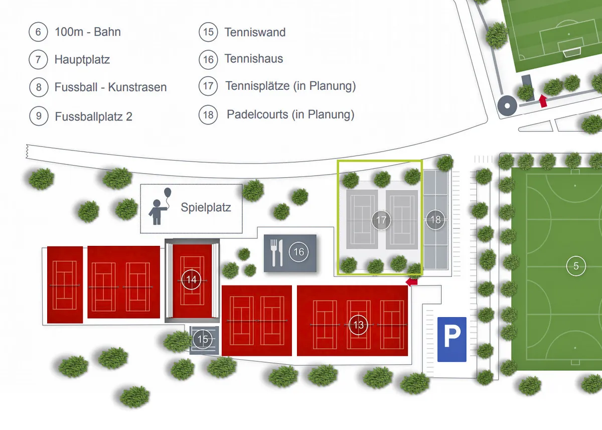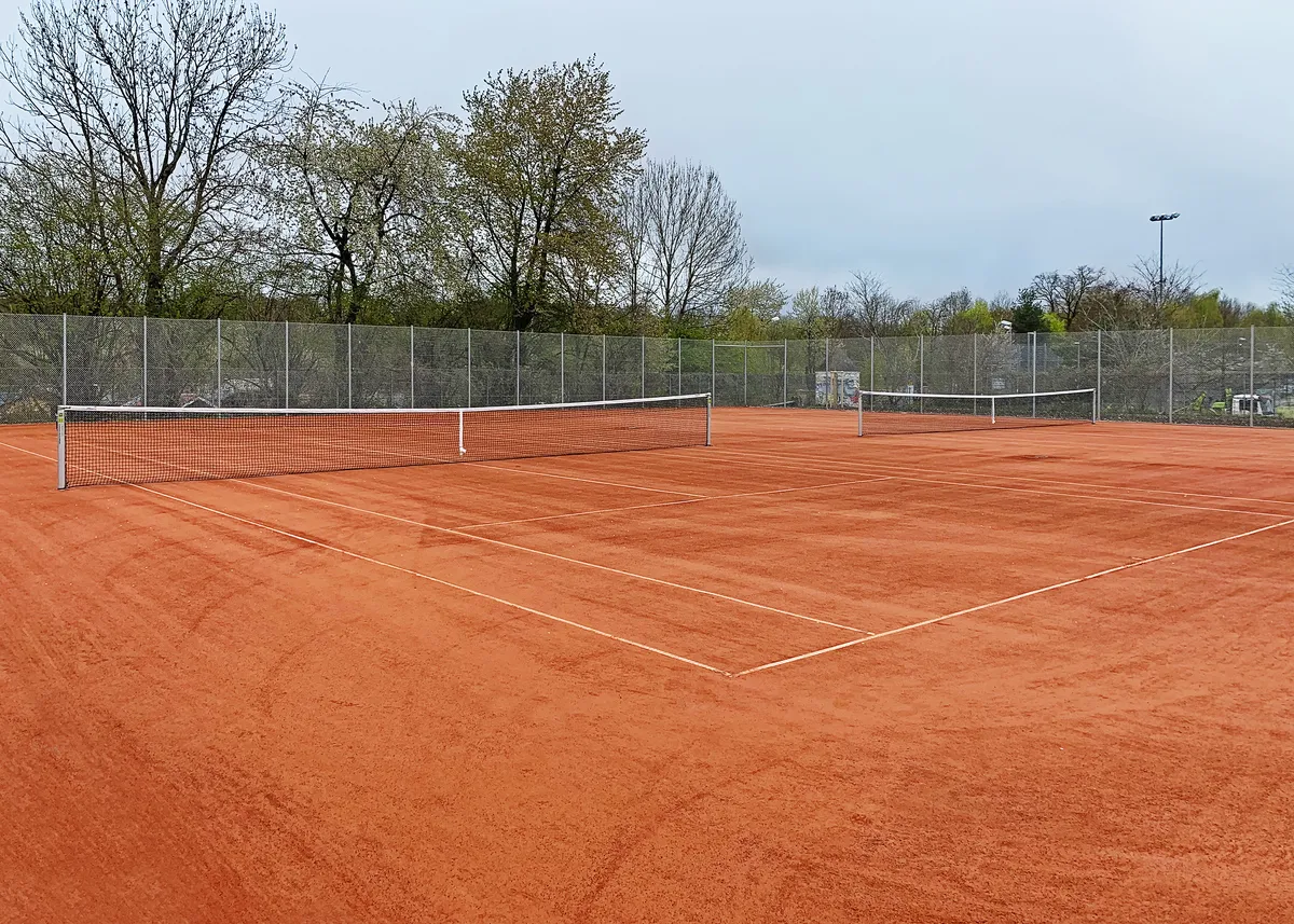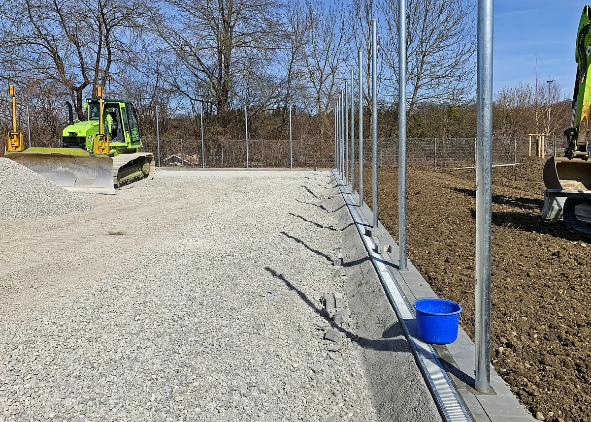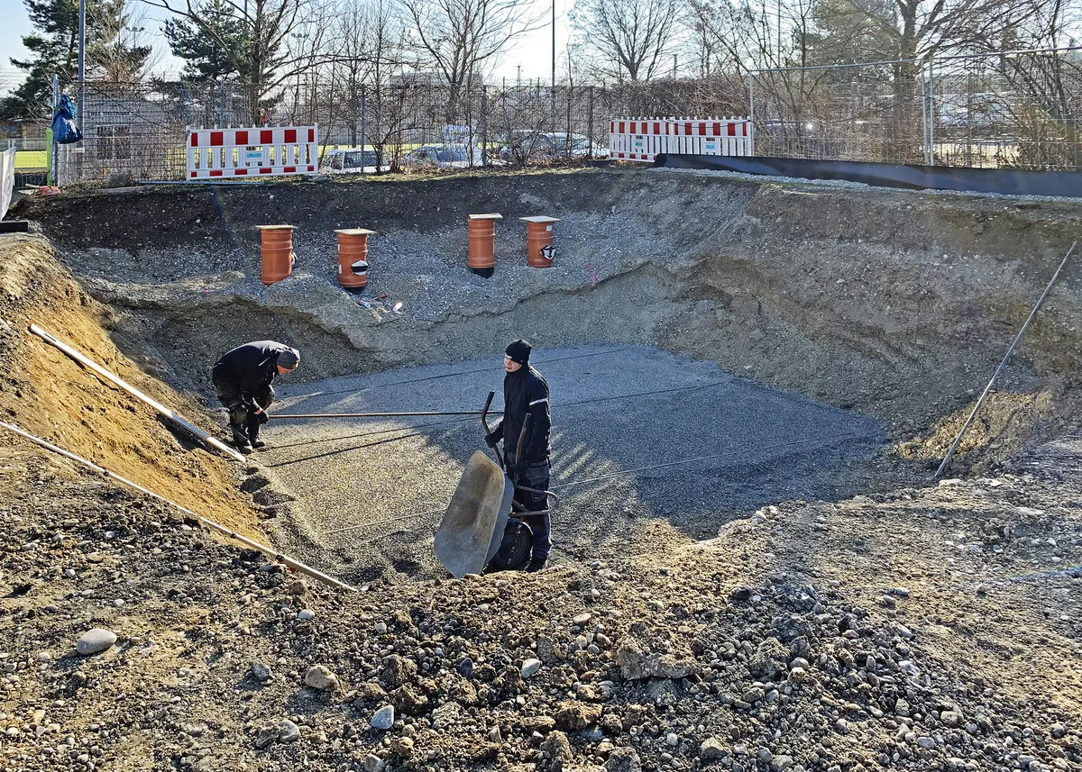 Die zwei Plätze entstanden „auf der grünen Wiese“ neben dem Tennis-Clubheim. Für das neue Baugrundplanum musste nach dem Abtrag der Bodenschichten zunächst der Baugrund mit einem Kalk-Zement-Gemisch verfestigt werden. Anschließend wurden für die Dränage zwei Sammlerstränge eingebaut, die jeweils über eine Sedimentationsanlage in eine Versickerungsrigole entwässern. Darauf konnte eine neue Tragschicht aus Schotter 2/32 eingebaut werden, die zum einen die Tragfunktion übernimmt, aber gleichzeitig eine Entwässerung über ihre gesamte Fläche gewährleistet.