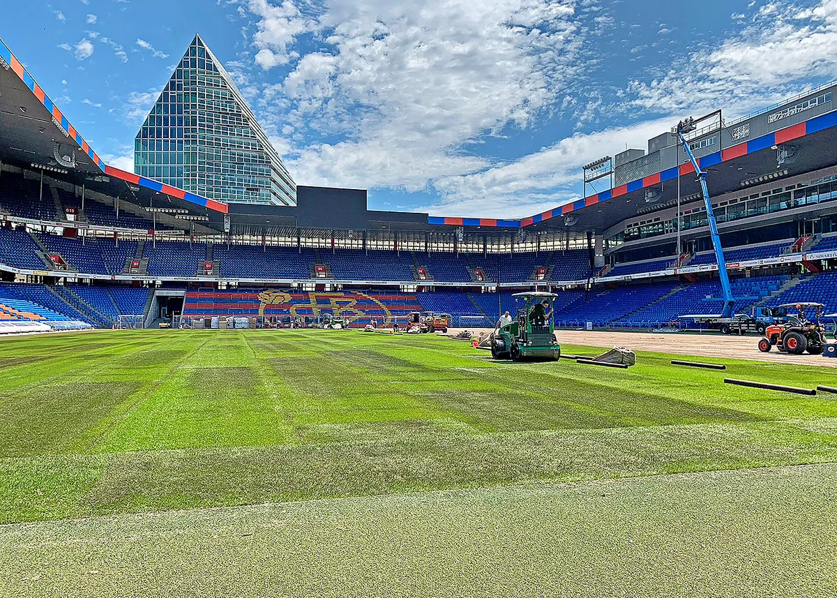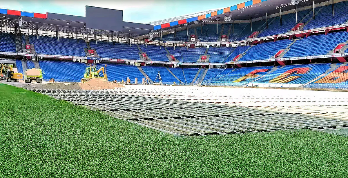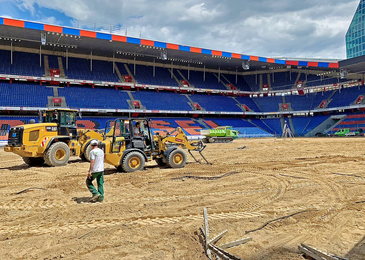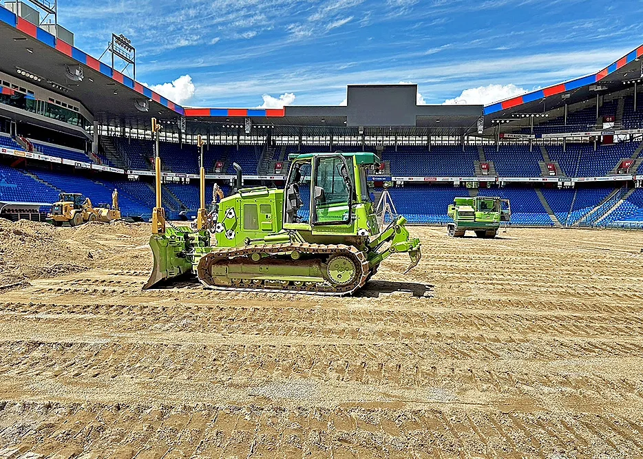 Zunächst wurden die Rasentragschicht und sämtliche Dränschichten abgetragen und entsorgt, ebenso die 26 km Heizleitungen ausgebaut und durch neue ersetzt. Der neue Schichtaufbau erfolgte nach deutschem Bundesliga-Standard und gemäß unserer DIN-Norm. Für die neuen Kies- und Dränschichten verbauten wir ca. 4.500 t Material und installierten 1,5 Kilometer Dränageleitungen. Zur bestmöglichen Dränage verwendeten wir speziellen, sehr wasserdurchlässigen Sand. Auf der neuen Rasentragschicht wurden dann ca. 7.500 m² Rollrasen aus den Niederlanden verlegt, der aufgrund der Sommerhitze mit Kühlfahrzeugen angeliefert wurde.