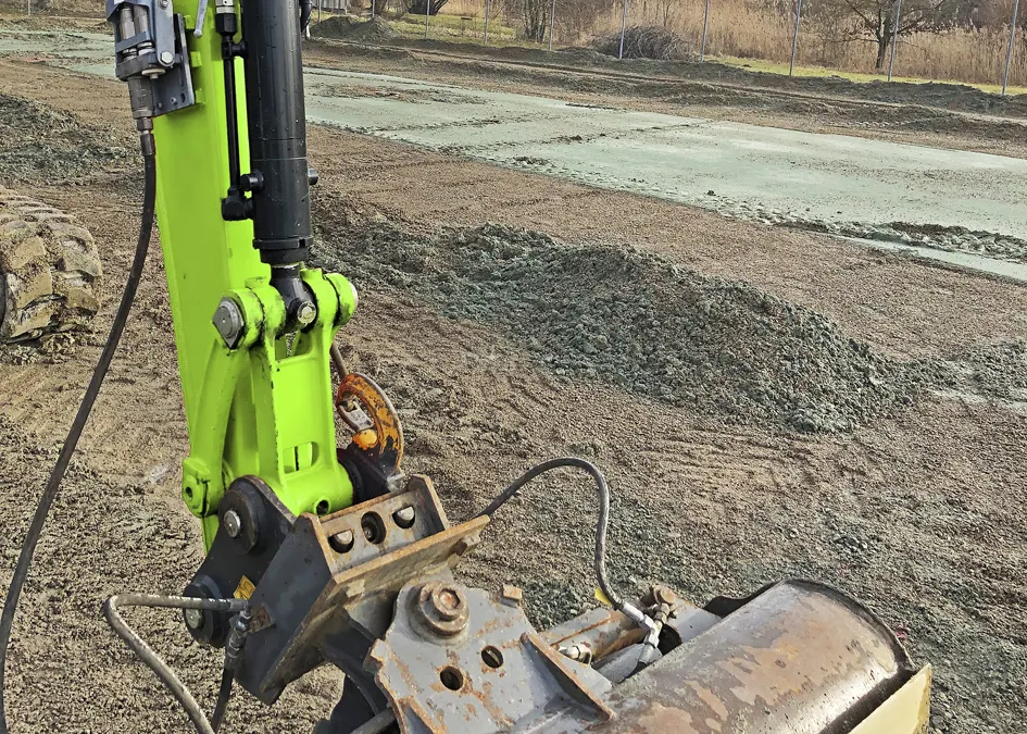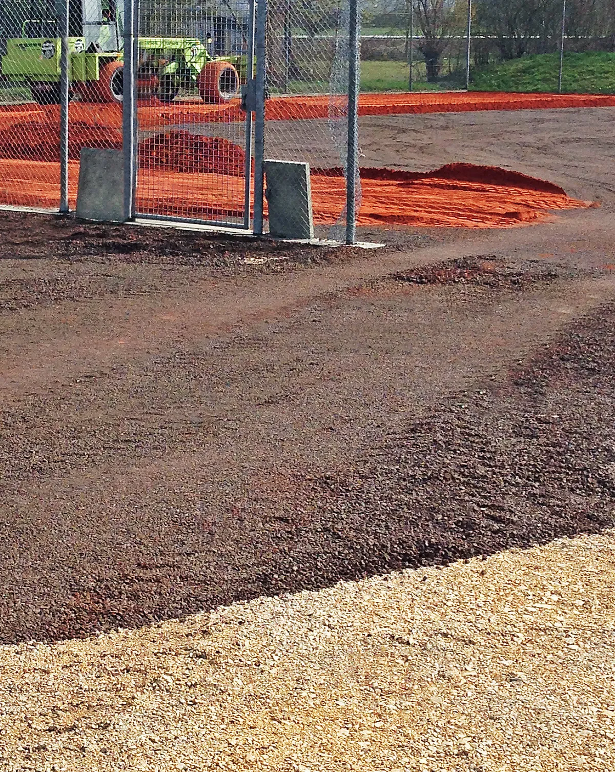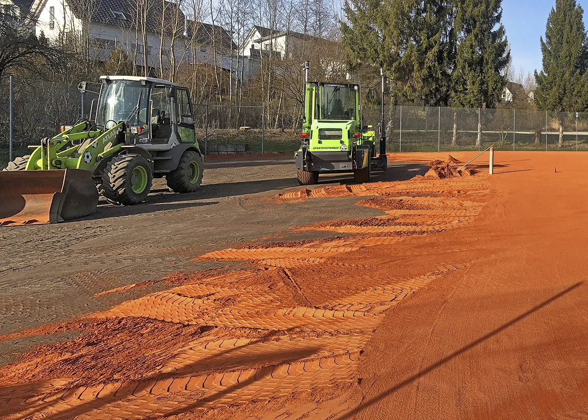 Zu Beginn der Arbeiten Mitte Februar bauten unsere Spezialisten zunächst die alte Canada-Tenn-Deckschicht ca. 4 cm tief aus und entsorgten sie (ca. 200 t), anschließend wurde die vorhandene Schottertragschicht aufgelockert, planiert und neu verdichtet. Auch die Drainage wurde ertüchtigt: die alten, punktuellen Hofeinläufe wurden ausgebaut und durch 144 m Entwässerungsrinnen längsseits ersetzt. Die vorhandenen Regner (sechs je Platz) passten wir an das neue Höhenniveau an.